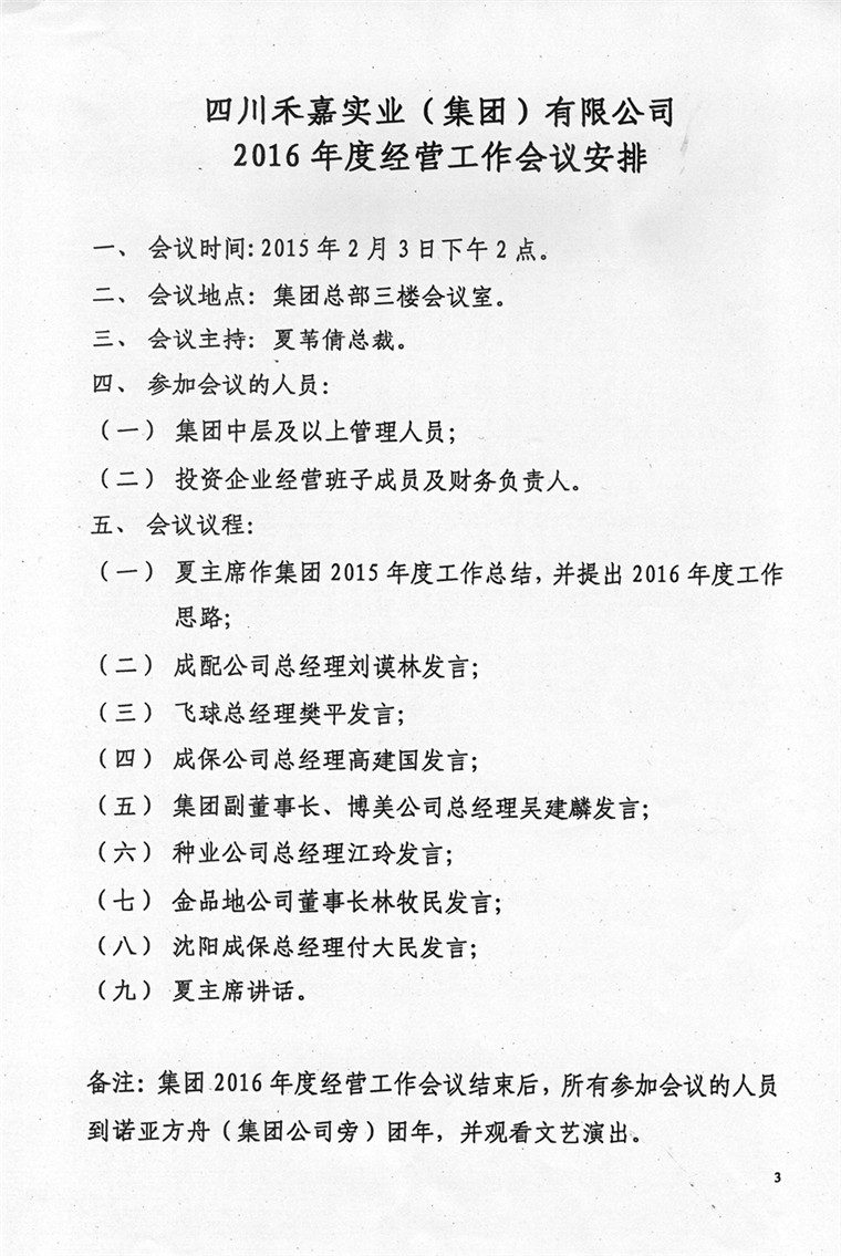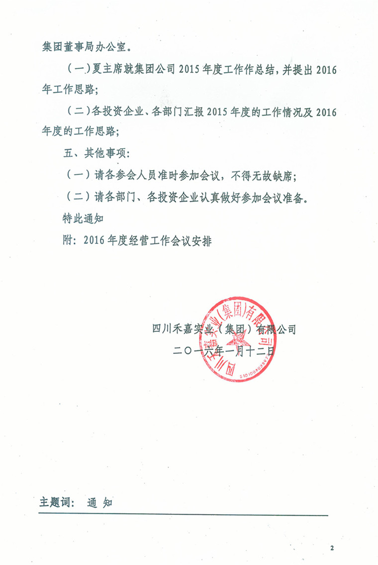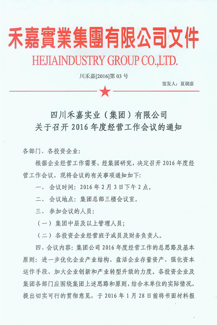 四川禾嘉集团关于召开2016年度经营工作会议及会议安排的通知