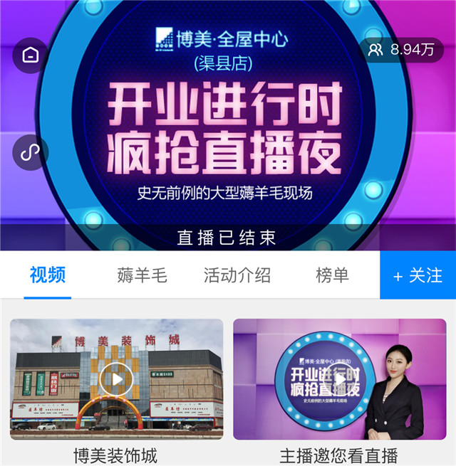 为本次开业活动预热,早在2020年4月20日,博美﹒全屋中心(渠县店)进行了首场开业直播,直播现场设置多项活动环节,分享有礼、集赞有礼、薅羊毛活动等,极大的提高了疫情期间的消费流量。据不完全统计,本次“开业进行时、疯抢直播夜”直播活动辐射人群将近9万人,为博美装饰城在更具消费潜力的三四线市场打开了影响力。