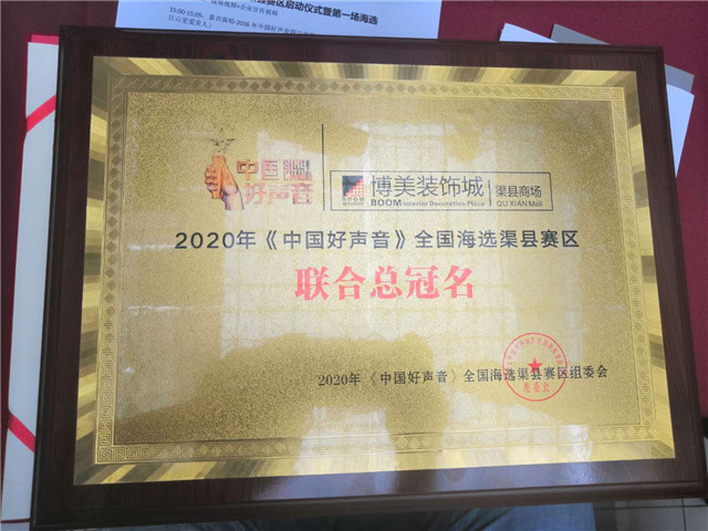 2020年6月18日,由渠县博美装饰城联合总冠名的《中国好声音》全国城市海选渠县赛区正式启动,启动仪式在渠县财富中心召开,中共渠县县委宣传部副部长郑六秋、共青团渠县县委副书记肖雄、渠县文化馆副馆长熊袁梅、2020《中国好声音》全国海选渠县赛区荣誉董事、成都陆福文化传播有限公司董事长陈庆彪、博美装饰城渠县商场经理黄端龙、渠县财富中心负责人蒲建霏以及众多战略伙伴共同出席了启动仪式。
