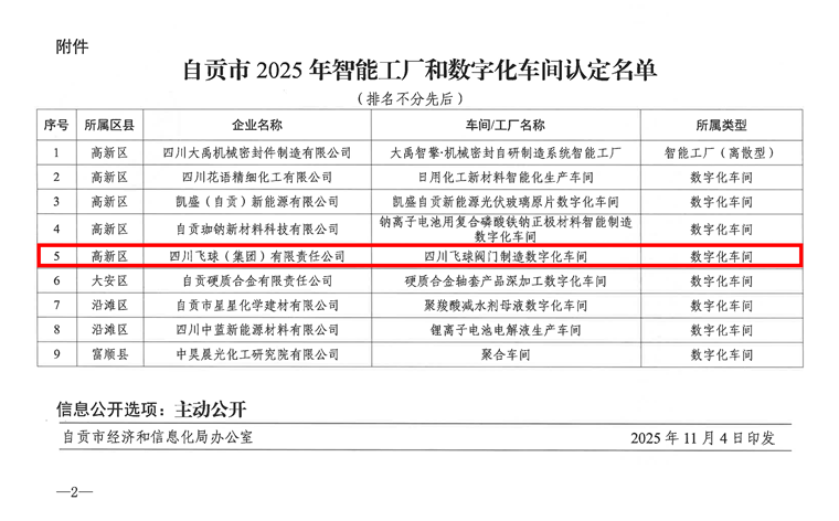 本网讯(彭奇报道)近日,自贡市经济和信息化局正式公布《自贡市2025年智能工厂和数字化车间认定名单》,四川飞球(集团)有限责任公司(以下简称“四川飞球”)凭借在数字化转型领域的突出实践,其申报的数字化车间成功入选,获得“自贡市2025年数字化车间”认定,成为全市阀门行业数字化升级的标杆企业之一。