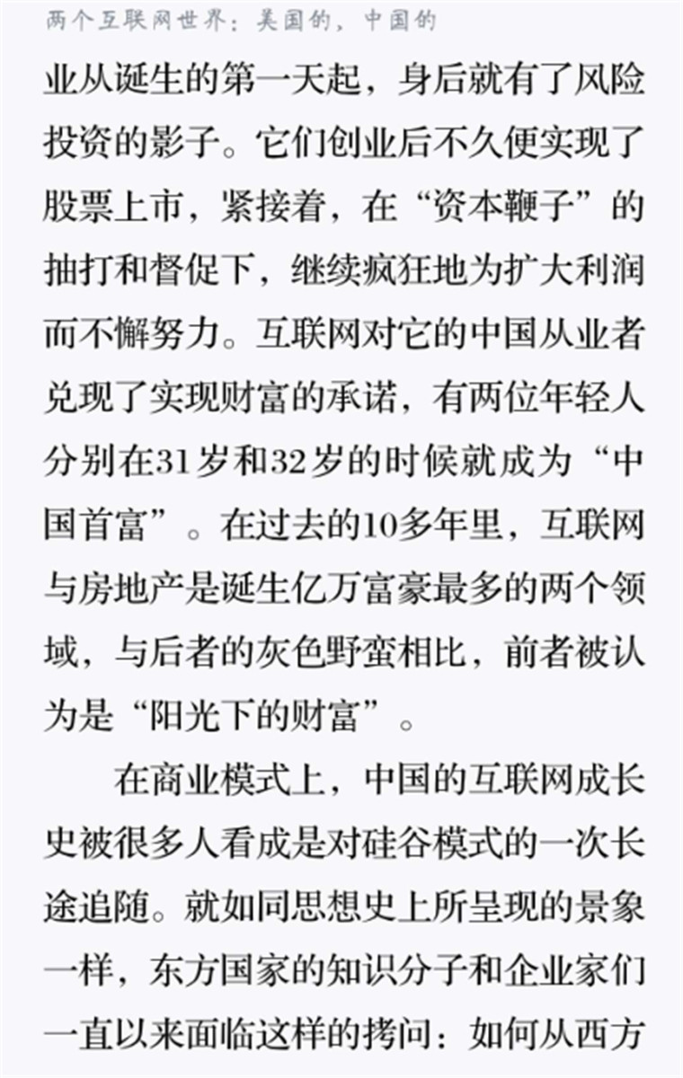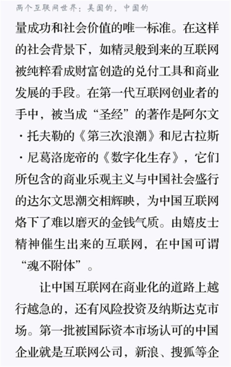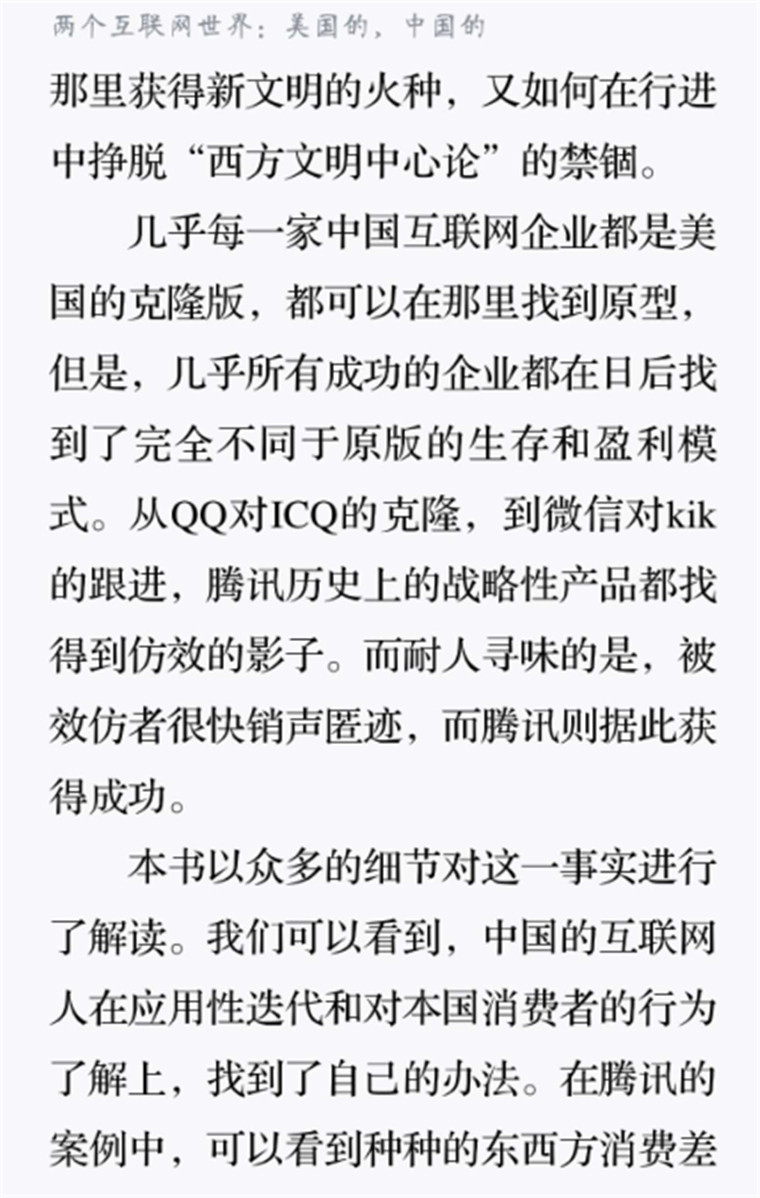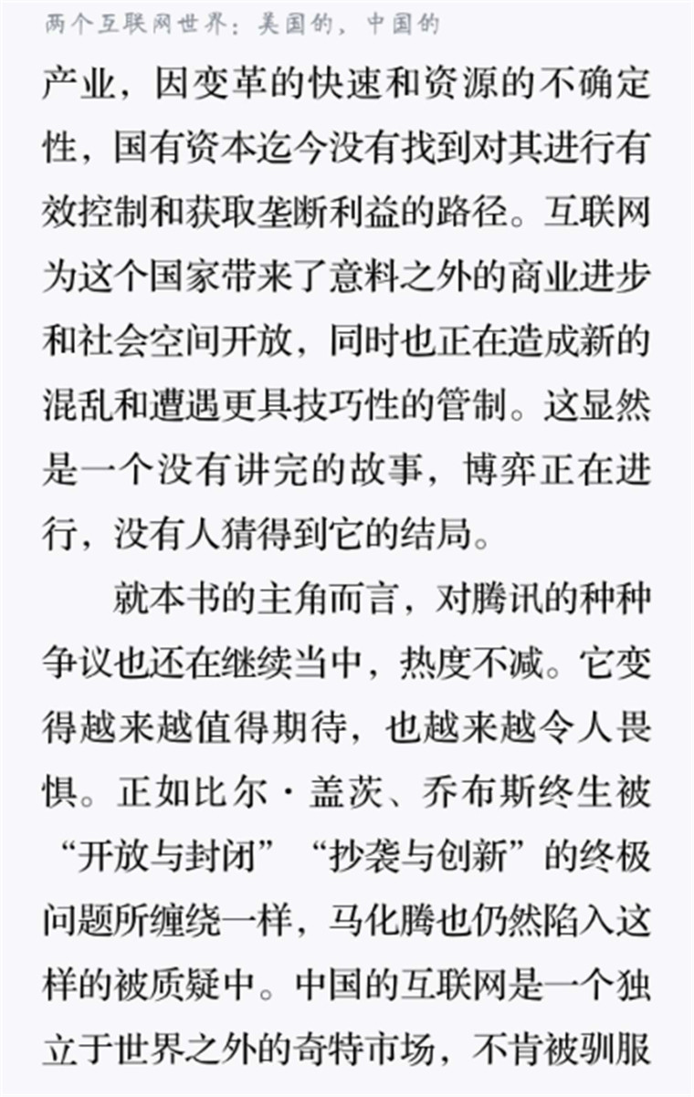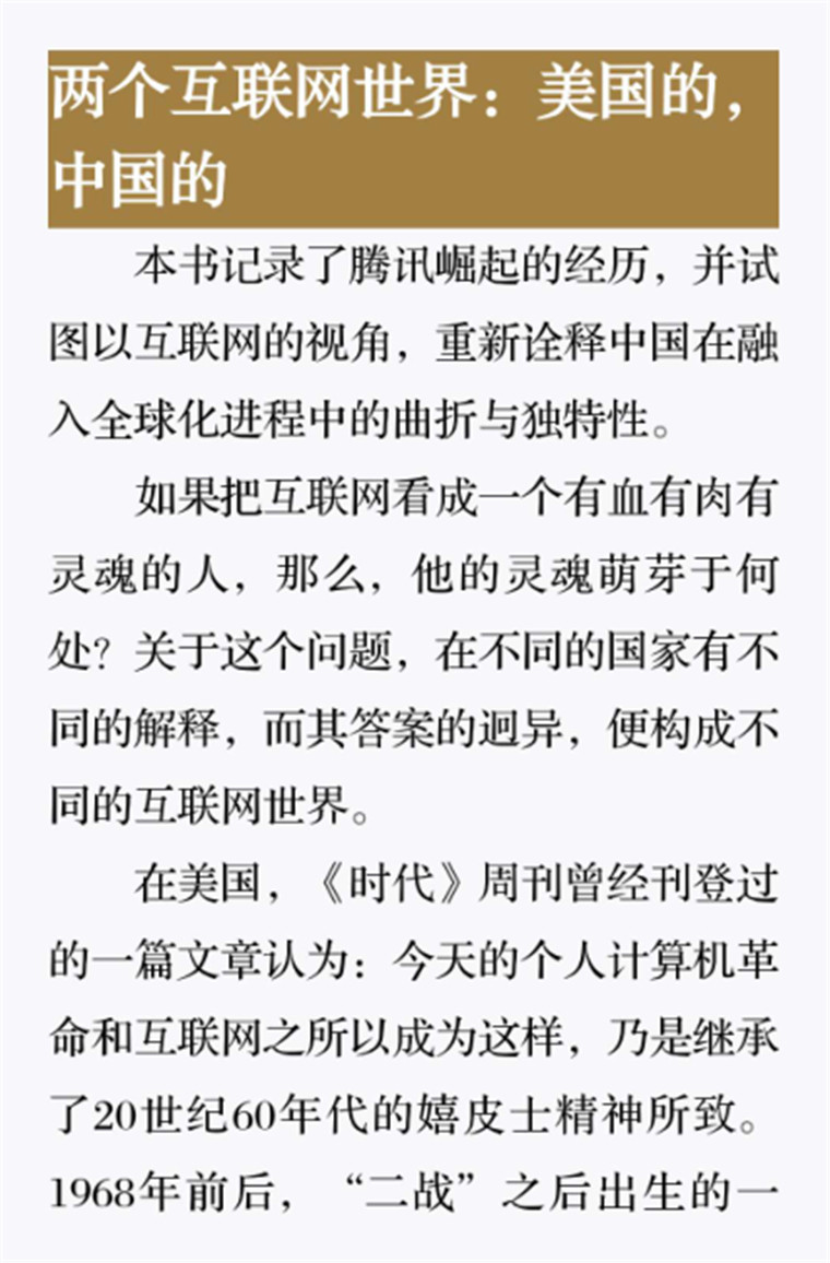 深读之后发现,其实全书真正的核心在于透过腾讯可以观察到的中国企业逻辑,其中很多基于国情而诞生的特殊能力,过去或受诟病或被追捧,而本书作者可以以更加客观的姿态对其进行分析,这无疑是一种当代创业者和企业家应当学习的姿态和能力。