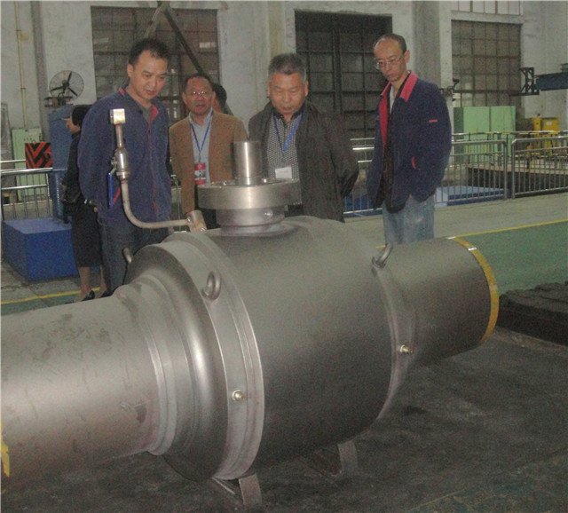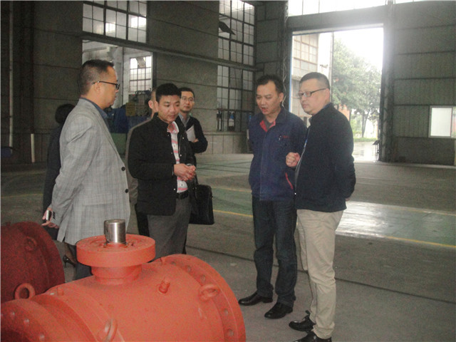来宾深入到金加工车间现场参观加工阀门零件的生产工艺流程,认真了解设备的加工能力。在热处理工段,姚总向来宾介绍了在中国阀门行业,飞球公司坚持质量管理和质保体系运行,注重阀门品牌,对阀门零件进行热处理,以确保其品质。在总装车间来宾参观了3200吨试压机,咨询了公司如何防止阀门泄漏等方面的情况。钟总和姚总、江总等领导分别对照阀门零件和成品,详尽地回答了来宾关心的有关技术问题,以及公司在确保产品质量方面采取的具体措施。在总装车间来宾饶有兴趣的观看了小口径阀门的装配过程。在球阀样机面前,姚总介绍道:2002年飞球公司率 先研制开发出了中国首台满足西气东输主管线要求的40吋、600磅级,全焊式锻钢气液联动管线球阀样机,经国内专家组鉴定确认,该产品各项性能指标均达到了世界同类产品水平,被科技部列入了国家A类重点新产口,填补了国内空白,被业内专家评价为“中国阀门制造史上的里程碑”。公司曾被国家“西气东输”领导小组授予“西气东输突出贡献奖”称号,这是中国阀门行业获得的唯 一奖项。