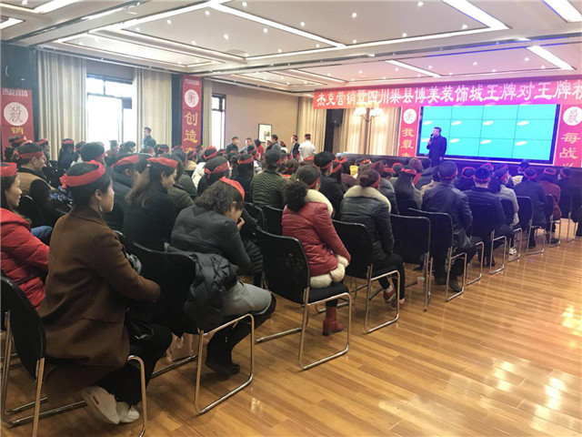 本网讯(谢碧静报道) 为了备战博美装饰城渠县商场将于2018年3月17日举行的主题为“王牌对王牌”——开年盛典促销活动,鼓舞商家士气,让商家系统学习营销知识,同时让商家及其工作人员熟悉整个活动流程,以便更好的为消费者提供服务,博美装饰城渠县商场于近日携手北京杰克营销在渠县碧瑶庄园二楼共同召开 “王牌对王牌”——开年盛典促销活动全员启动培训大会。