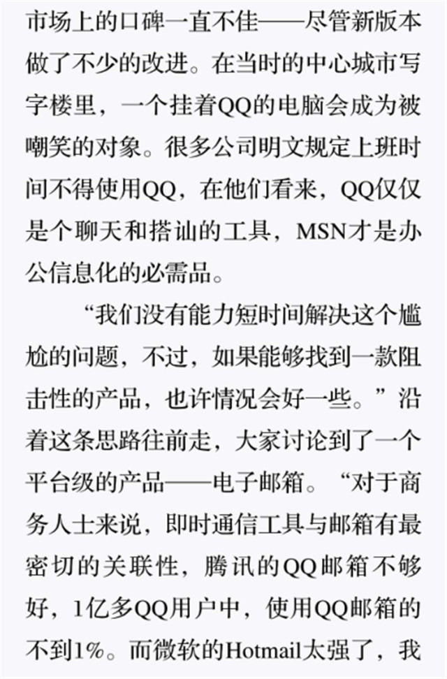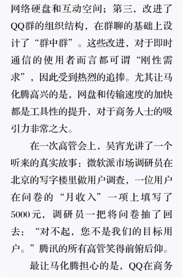 深读之后发现,其实全书真正的核心在于透过腾讯可以观察到的中国企业逻辑,其中很多基于国情而诞生的特殊能力,过去或受诟病或被追捧,而本书作者可以以更加客观的姿态对其进行分析,这无疑是一种当代创业者和企业家应当学习的姿态和能力。