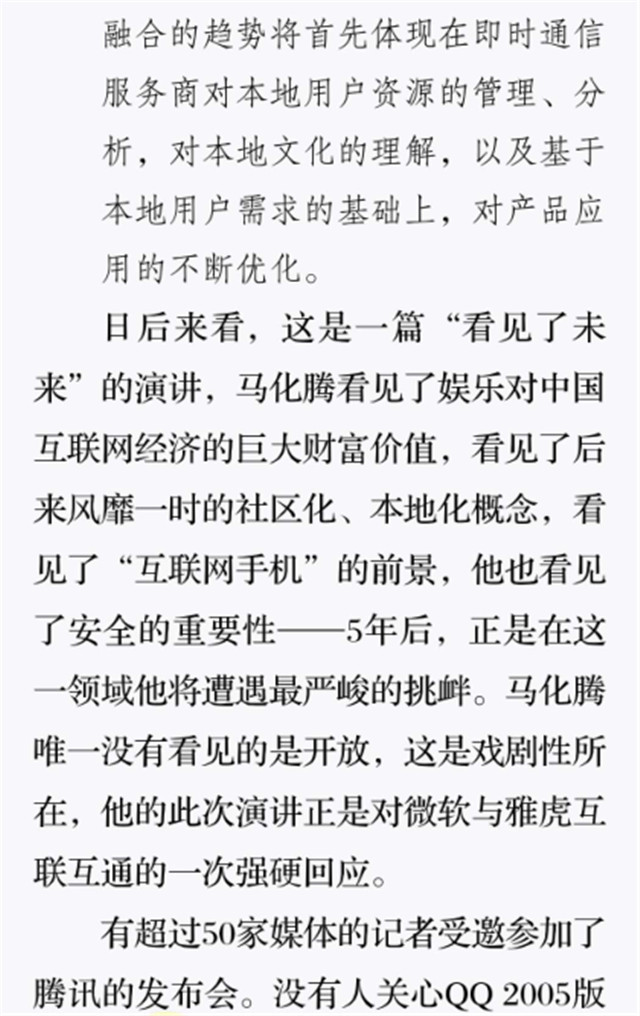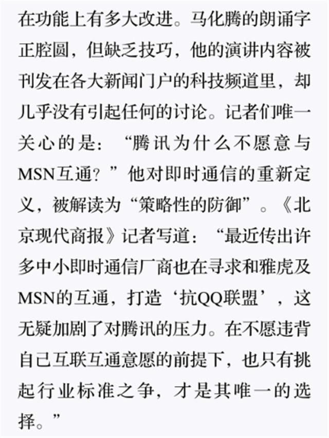 深读之后发现,其实全书真正的核心在于透过腾讯可以观察到的中国企业逻辑,其中很多基于国情而诞生的特殊能力,过去或受诟病或被追捧,而本书作者可以以更加客观的姿态对其进行分析,这无疑是一种当代创业者和企业家应当学习的姿态和能力。