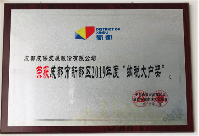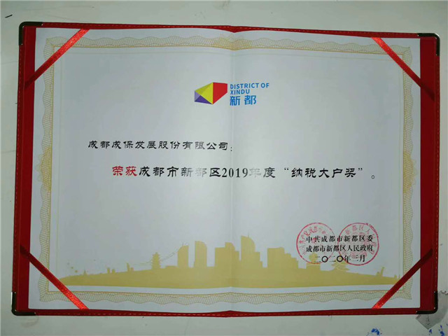 2020年3月20日,中共成都市新都区委、成都市新都区人民政府联合召开新都区营商环境暨复产满产稳增长工作会。公司营销经理(兼工会主席)张扬代表成保公司参加了本次会议。此次会议表彰中,成保公司荣获成都市新都区2019年“纳税大户奖”,区委、区政府对成保公司推进地区工业经济发展所作出的贡献给予了充分的肯定。
