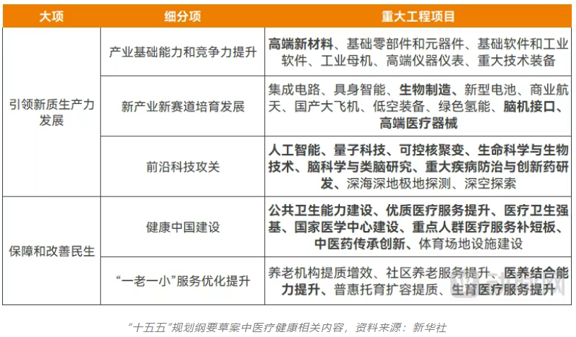 在医疗健康领域,“十五五”规划纲要草案在持续推进公共卫生、医疗服务、基层医疗、养老生育等常态化任务的基础上,进一步围绕新产业新赛道、前沿科技攻关等“硬科技”方向布局医疗相关内容,为未来五年医疗领域前沿科技创新指出路径。