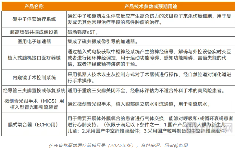 2025年,国家药监局发布《关于优化全生命周期监管支持高端医疗器械创新发展有关举措的公告》,以政策集成创新支持高端医疗器械产业发展,提出了从研发立项、注册申报、审评审批到上市后再评价的全链条支持政策;并聚焦核心领域,制定了《优先审批高端医疗器械目录(2025年版)》,进一步支持具有显著临床应用价值和临床急需的高端医疗器械。